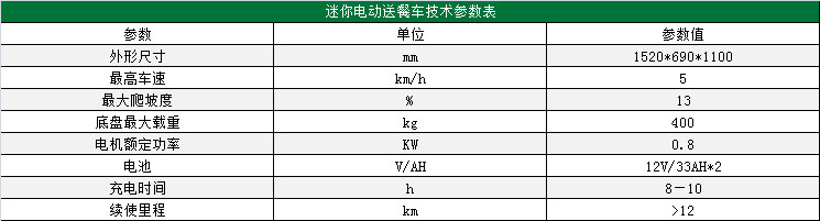 瑪西爾迷你電動送餐車,車體地盤采用國際鋼材、高強度國標(biāo)二氧化碳保護焊接結(jié)構(gòu),表面作防銹處理;車體內(nèi)部設(shè)計不銹鋼保溫餐箱,車廂內(nèi)部溫度可智能化控制;采用800W直流永磁電機,電磁剎車安全性高;配置智能PG控制器及高性能免維護鉛酸蓄電池;車輛整體小巧靈活,經(jīng)濟實用。適用于城鎮(zhèn)街道、學(xué)校、醫(yī)院、機場、車站、旅游景區(qū)、居民生活區(qū)等場所。